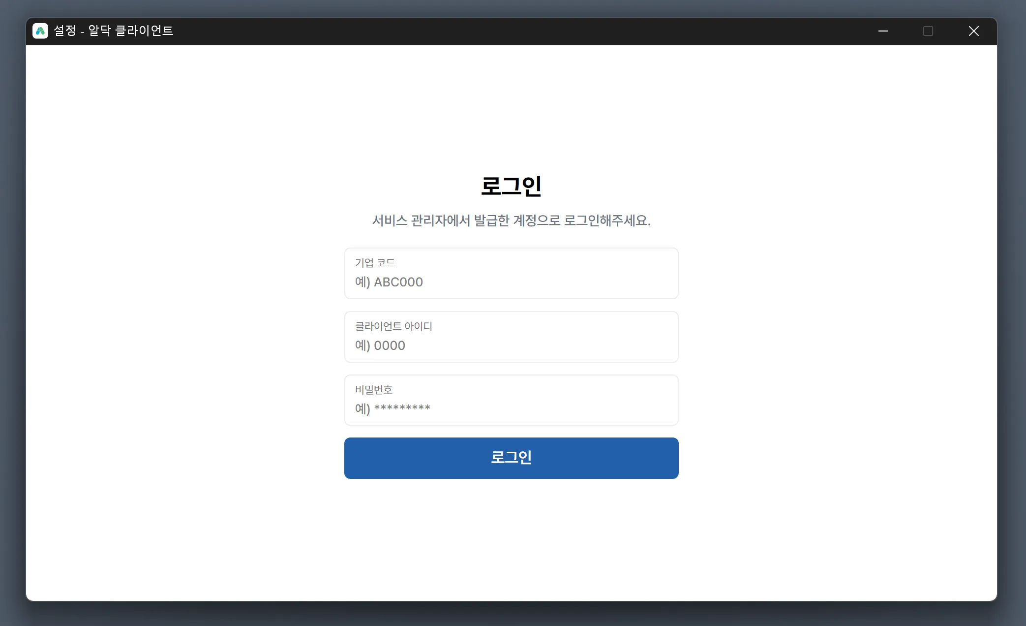Section titled “3. 프로그램 실행 및 로그인”설치가 완료되면, 프로그램이 실행됩니다. 알닥 가입 시 전달 받은 기업 코드와 아이디, 비밀번호를 입력 후 로그인 버튼을 눌러주세요.