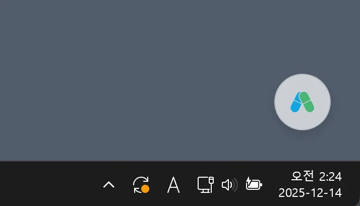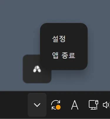 Section titled “7. 프로그램 설정 및 종료 접근”알닥 클라이언트는 작업 표시줄의 아이콘을 통해 제어합니다. 아이콘을 우클릭하여 설정 변경 및 프로그램 종료가 가능합니다.