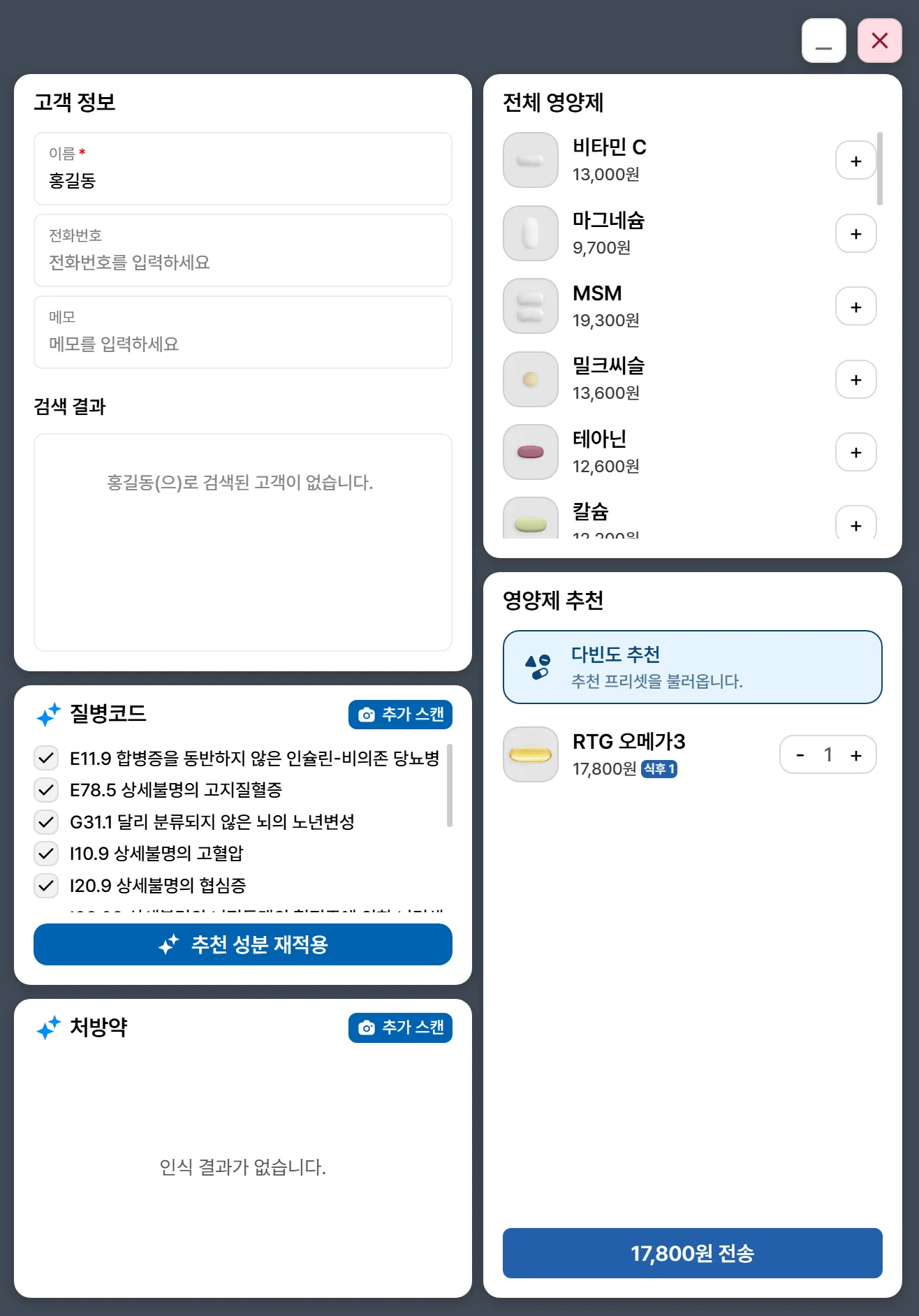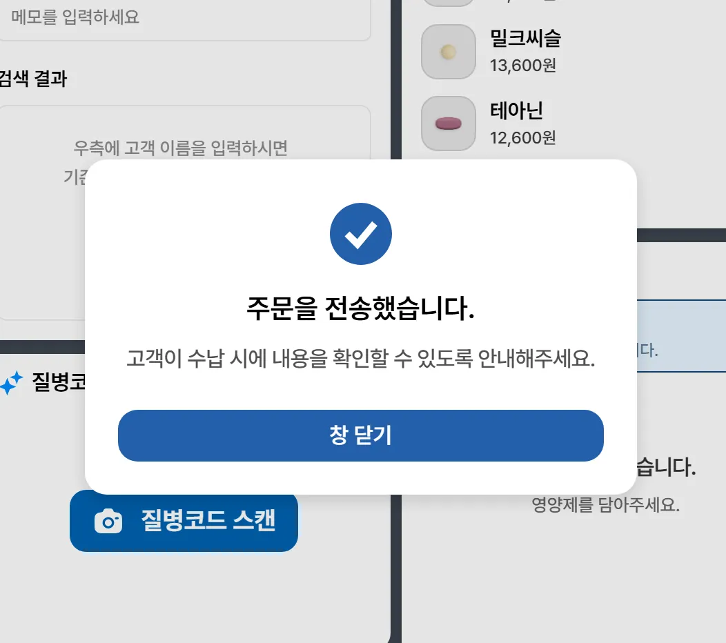 Section titled “6. 고객에게 안내”전송이 완료되면, 고객에게 적절한 안내를 진행합니다. 고객은 수납하며 영양제 정보를 확인하고, 최종 주문을 결정할 수 있습니다.